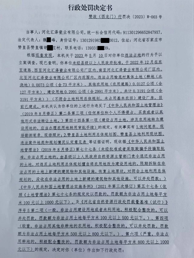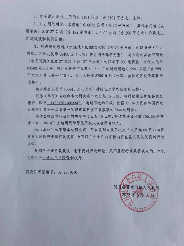 赞政(西龙门)罚决〔2023〕W-003号