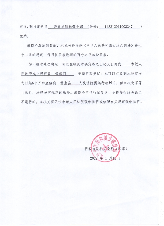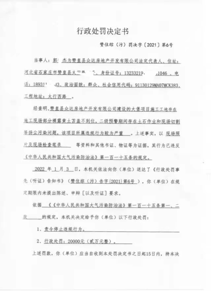 行政处罚决定--赞住综(污)罚决字【2021】第6号