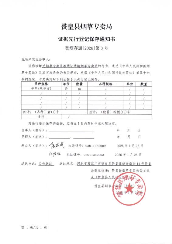 赞皇县烟草专卖局证据先行登记保存通知书(赞烟存通【2026】第3号)