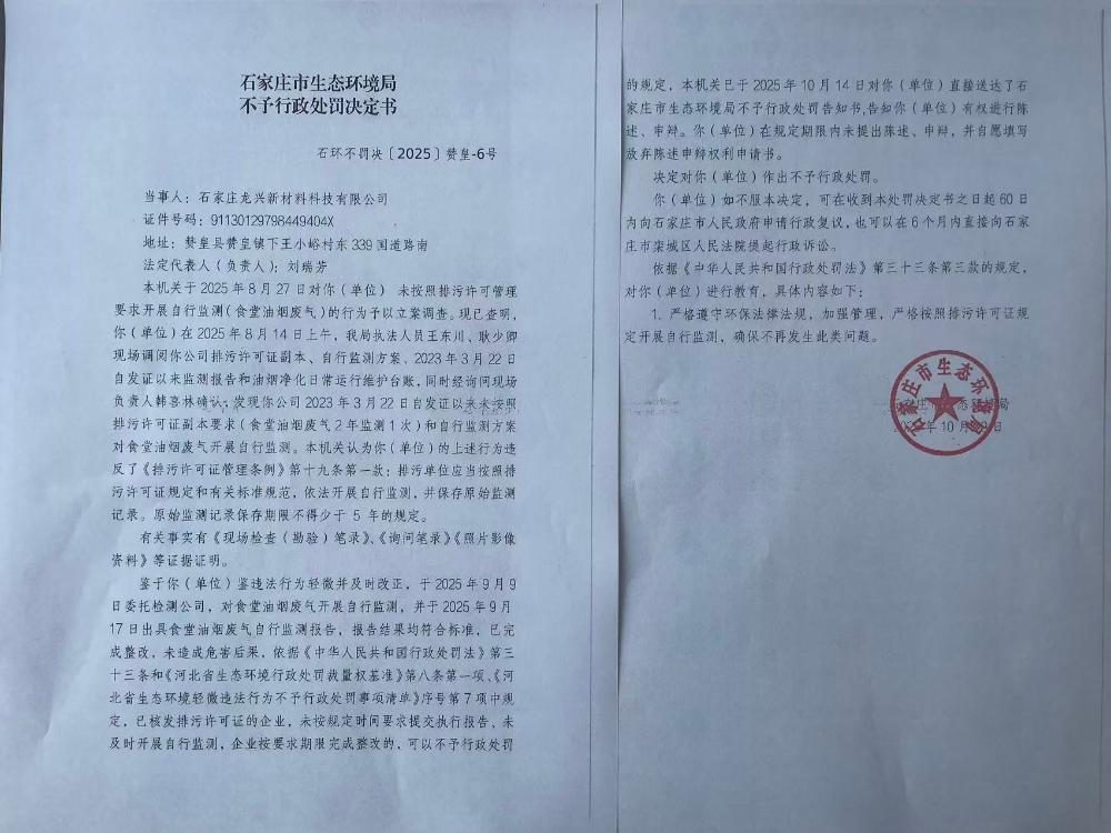 石家庄市生态环境局赞皇县分局对石家庄龙兴新材料科技有限公司作出不予行政处罚决定(石环不罚决【2025】赞皇-6号)